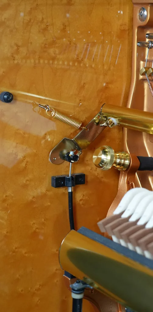 Das Innere der Master Series zeugt in jedem Detail von akribischer Handwerkskunst. Die Seitenwände aus Vogelaugenahorn, die an einen Shigeru Kawai Flügel erinnern, strahlen eine tiefe, edle Schönheit aus, während poliertes Messing durchgängig in allen Komponenten verwendet wird – von den Vorder- und Hinterrollen über die Pedale bis hin zu den inneren Schrauben – und einen warmen, luxuriösen Glanz verleiht. Fein bearbeitete Rahmen und Beschläge unterstreichen diese Eleganz selbst an versteckten Stellen und schaffen eine Präsenz, die sowohl visuell beeindruckend als auch akustisch außergewöhnlich ist.
